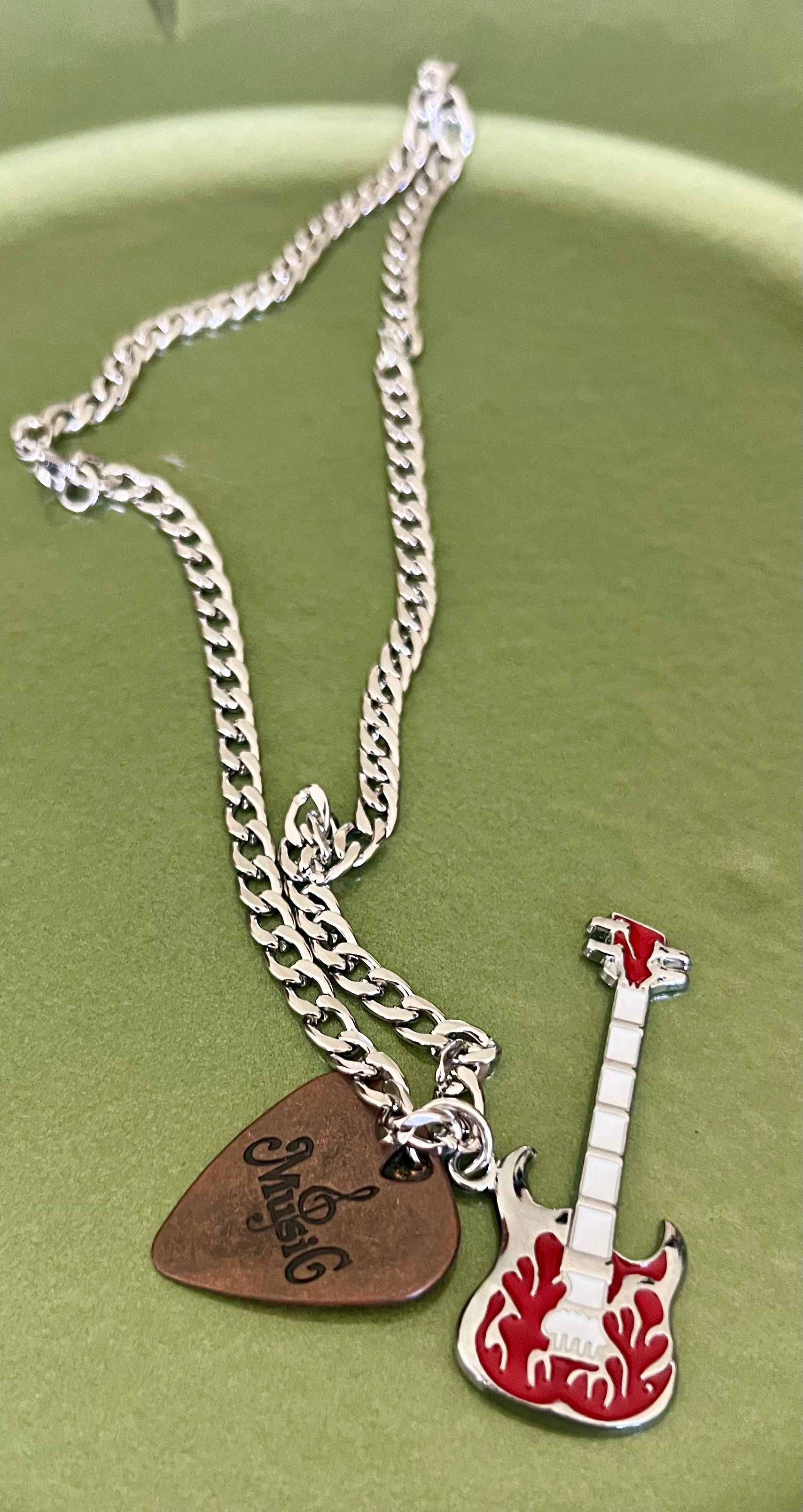 Guitar/guitar pick red necklace. Chain measures 9.5”