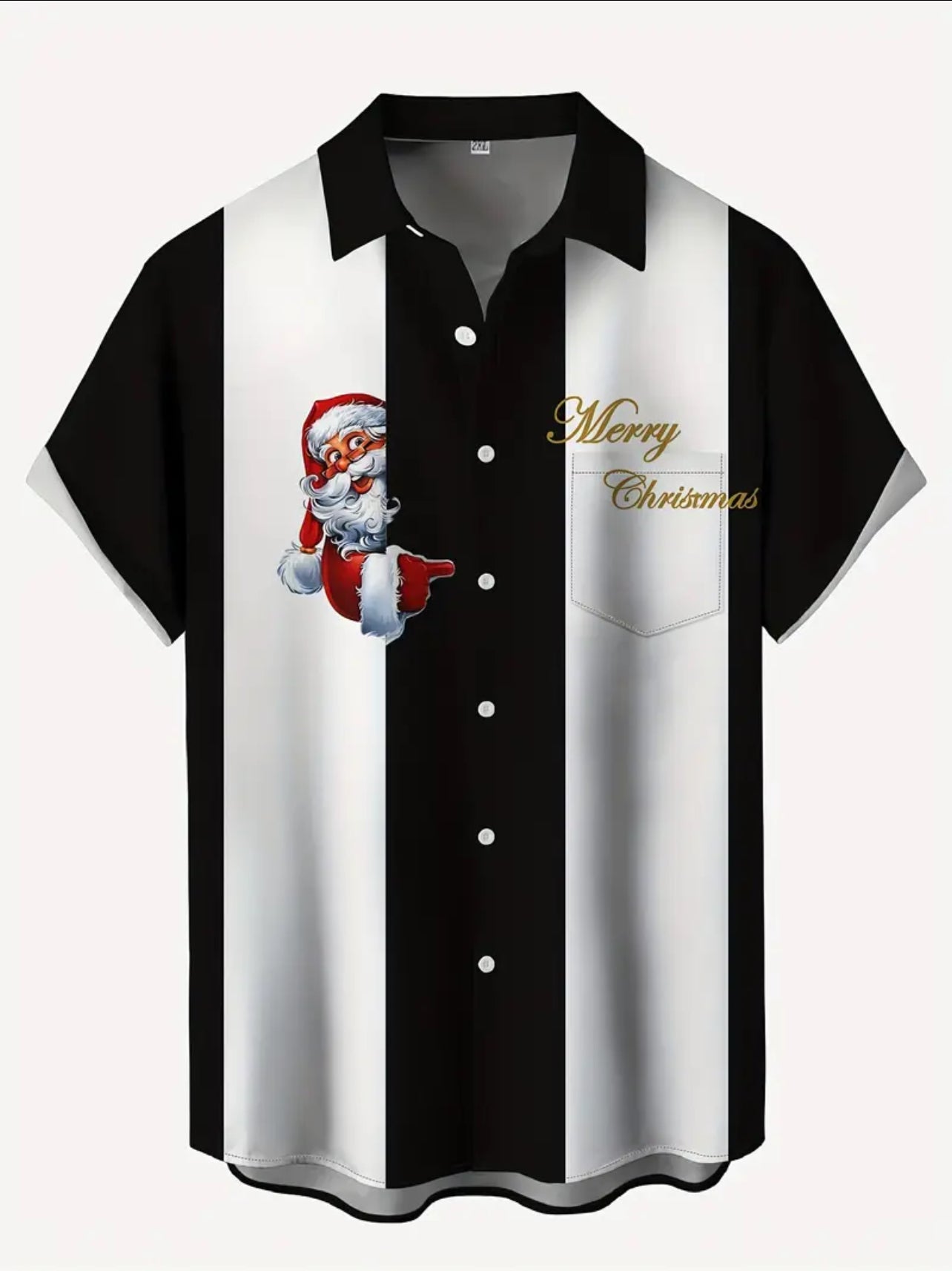 Short Sleeve Black/White Button Up Santa Design Shirt.